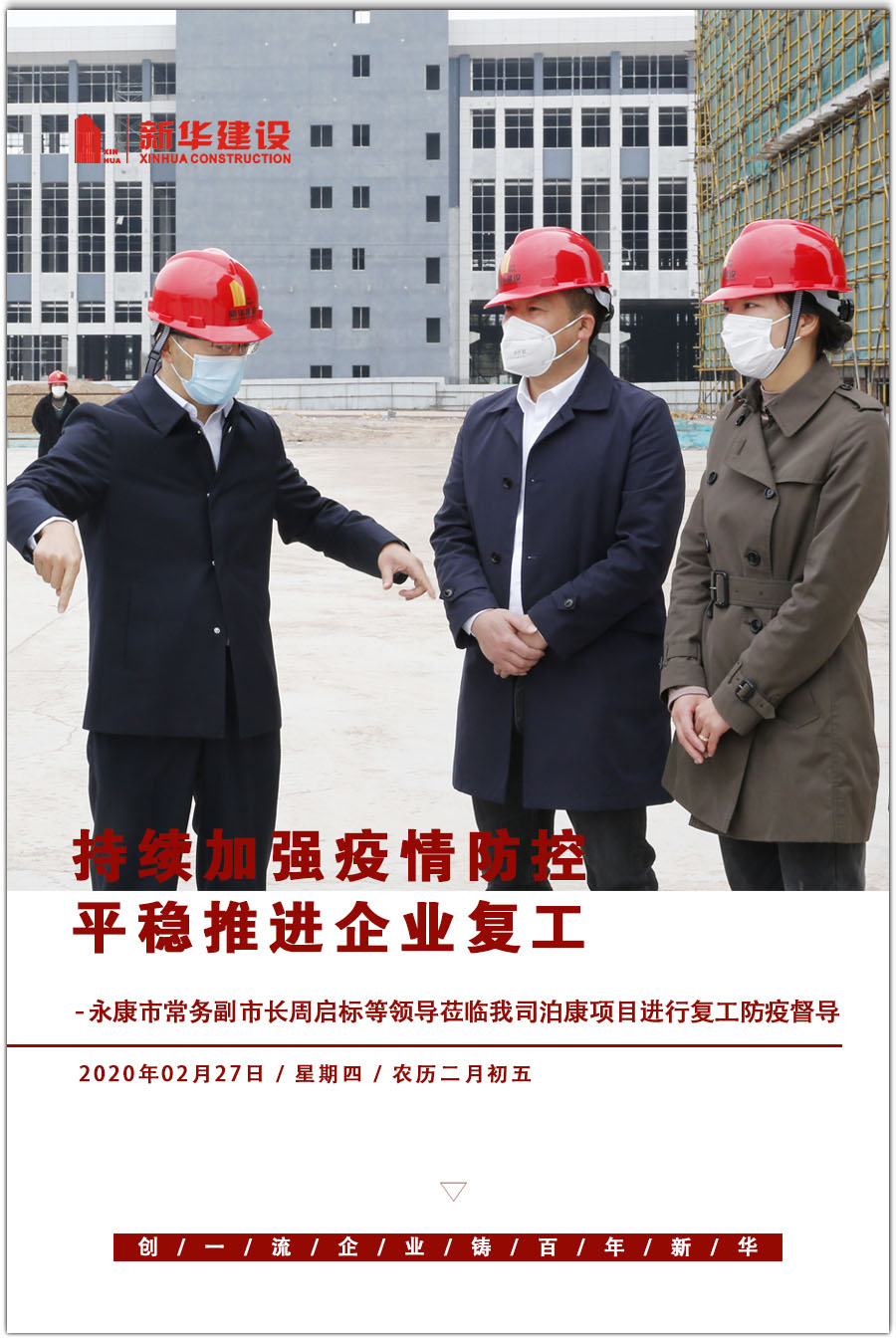 2月27日,永康市常务副市长周启标等领导莅临我司泊康项目部现场,督导项目疫情期间复工复产中防疫工作的实施情况,新华建设有限公司相关领导徐玲玲、柴杏成等陪同。