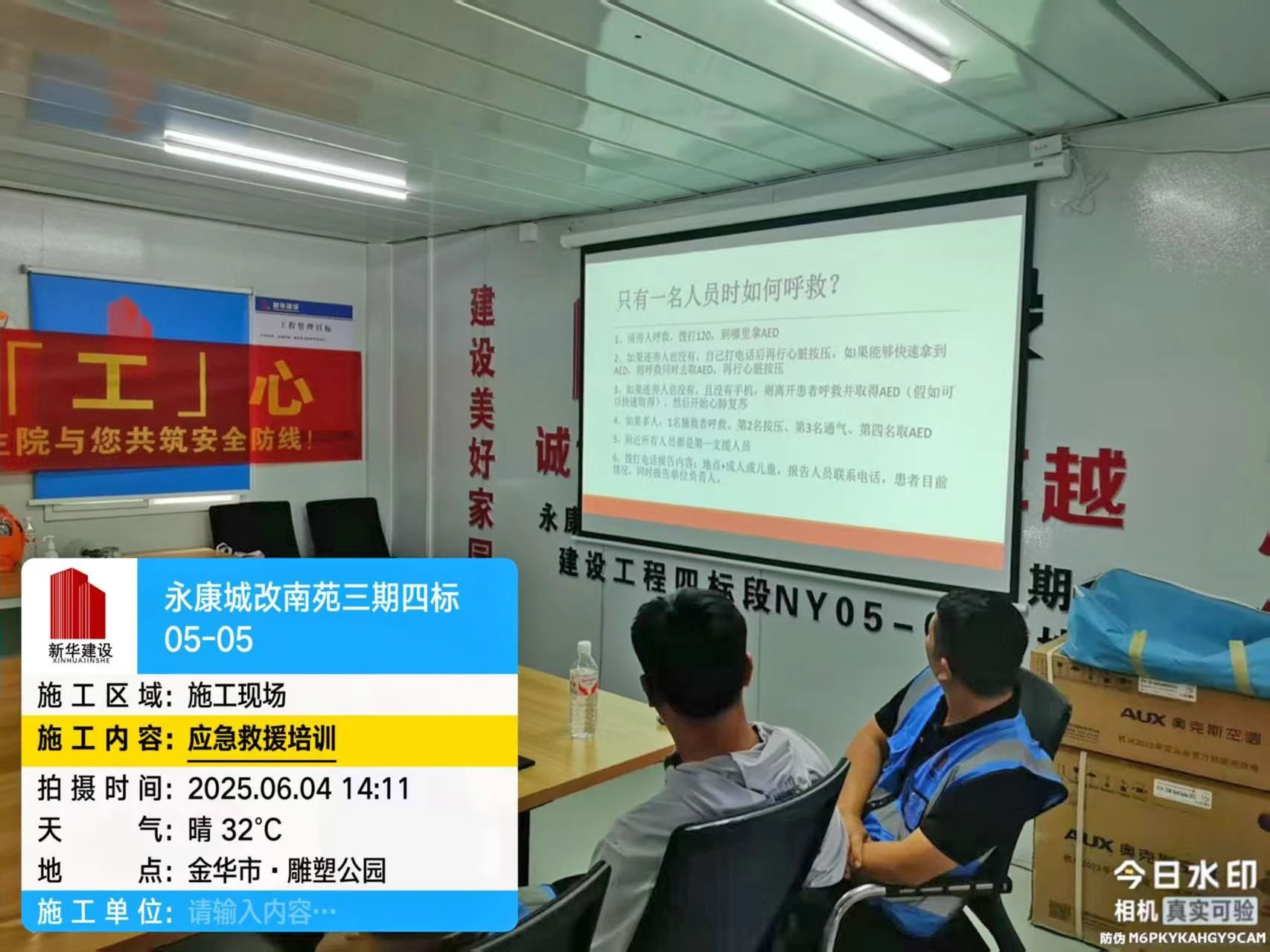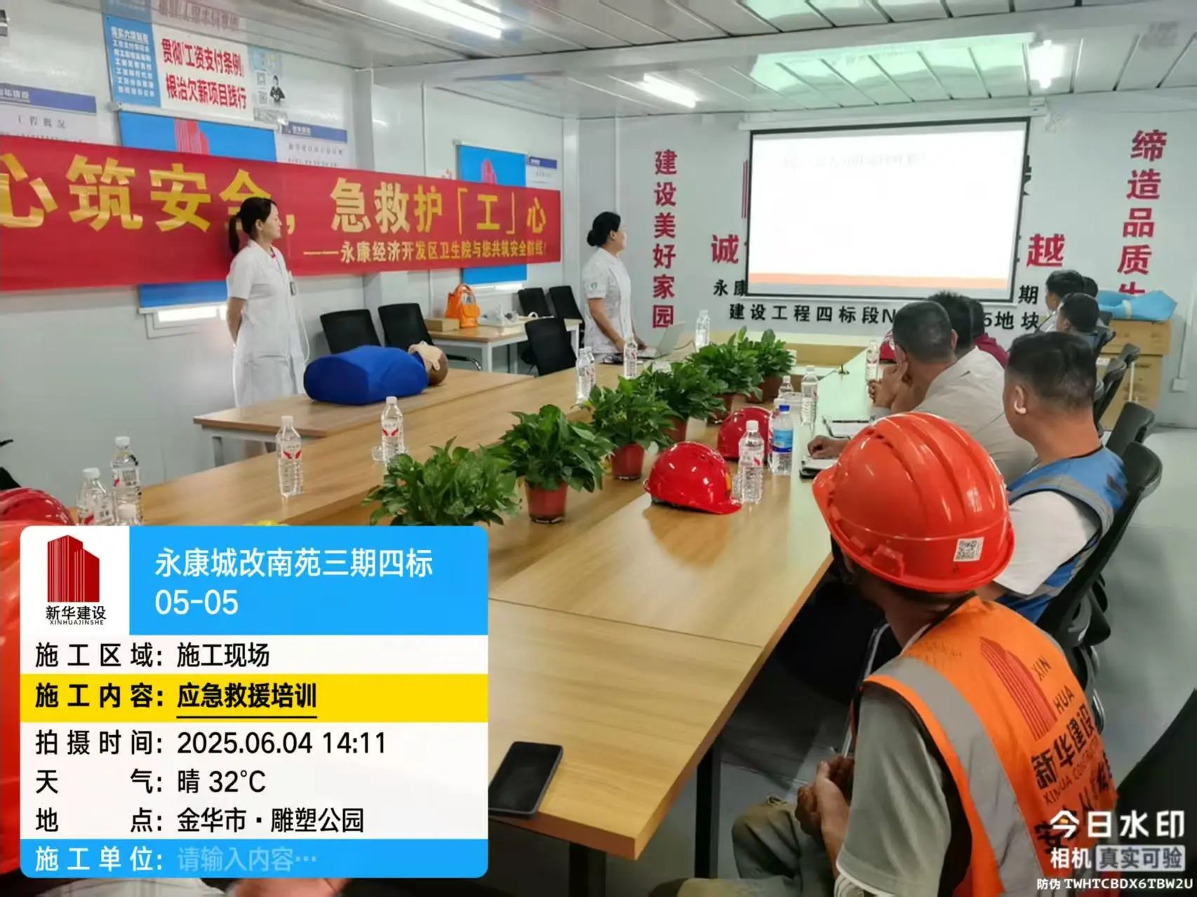 6月4日,集团承建的永康市城市更新南苑片区(三期)建设工程四标段NY05-05地块项目部开展了一场别开生面的“安全生产月”活动。特邀永康市靠前人民医院医共体经济开发区分院医护人员,为建筑工地一线施工作业人员进行急救知识培训。